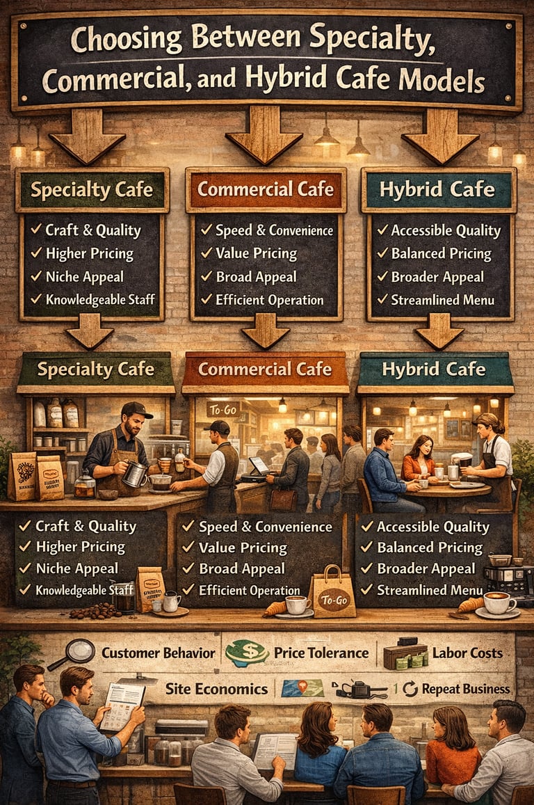 Choosing between specialty, commercial, and hybrid cafe models is not a branding exercise. It is a business-model decision.