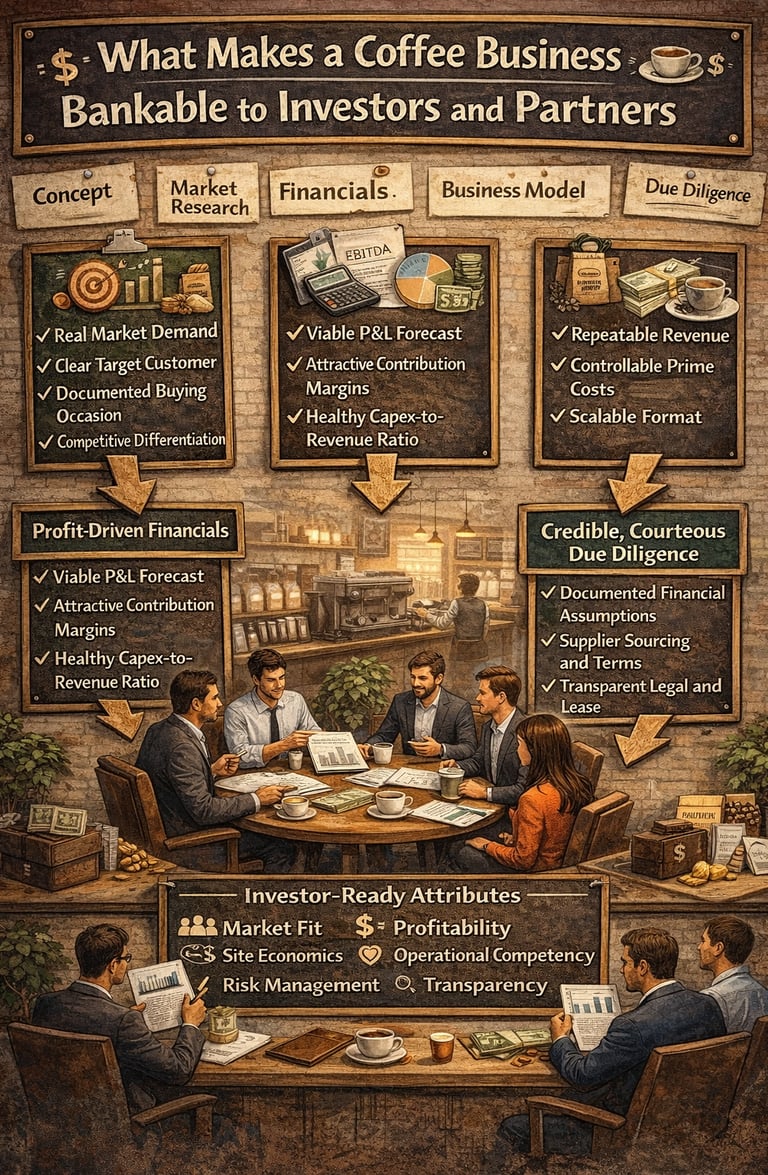 Learn what makes a coffee business bankable to investors and partners, from market fit and unit economics to operational control and due diligence readiness.